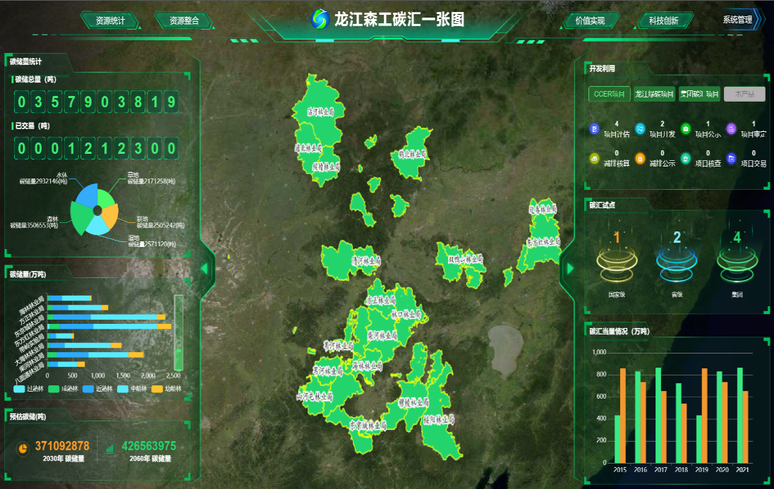 项目的技能探究一直与国家战略同频共振。为服务“双碳”方针,团队研制的“双碳”绿色开展渠道,为龙江森工碳财物公司完结了林业碳汇项目从基线查询、碳储量计算到项目申报、监测核对的全链条数字化办理。以往需求3个月才干完结的碳汇项目规划文件,现在经过渠道仅需几分钟就可以完结,功率大幅度的进步,为我国林业碳汇资源开发供应了技能支撑。
