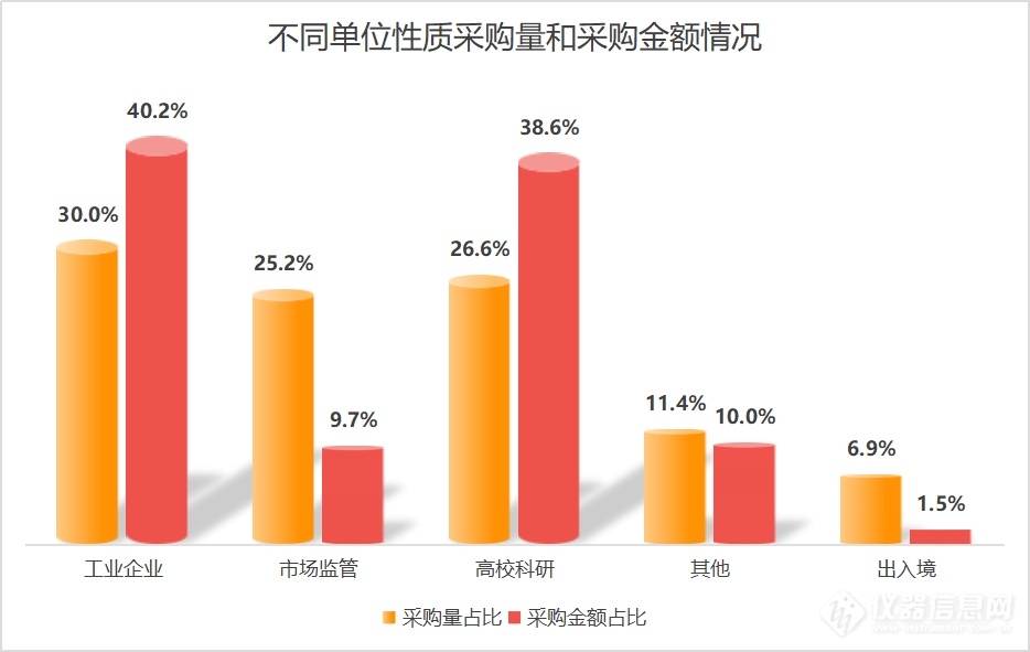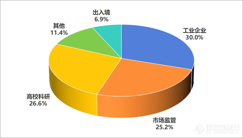 其次是高校科研单位和市场监管单位。由于超过70%的工业公司未公布详细采购品牌和型号,这使得针对工业公司的数据分析参考性受到一定限制。尽管有几率存在某些仪器厂商在工业公司领域具有非常明显优势,但在本次统计分析中难以充分体现。